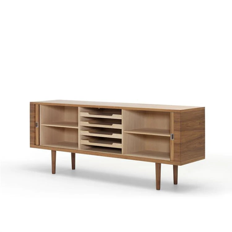 The Halden Sideboard is a quiet declaration of architectural harmony and material integrity. Built from solid wood with crisp edges and seamless joinery, its minimal profile conceals thoughtful function and deliberate craft. Behind the understated doors lies a precise‐engineered interior—perfect for media storage or artful concealment.