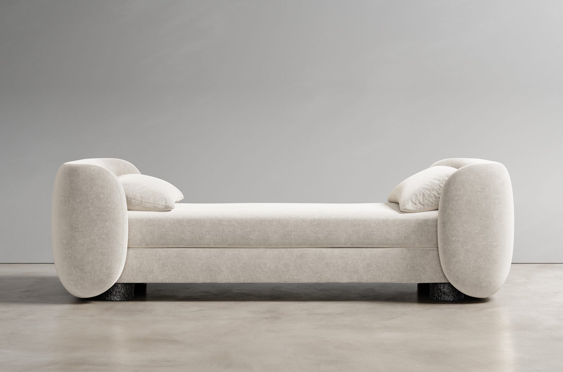 The Nóir Daybed is a sculptural masterpiece that embodies quiet luxury and contemporary elegance. With its bold, rounded silhouette and low, architectural stance, it makes an unapologetic statement in any space. Upholstered in a rich ivory fabric, its soft contours are framed by generously curved arms, offering both comfort and form. The base is anchored by charred wood cylinder legs—introducing an organic, tactile contrast that grounds the piece in elemental sophistication.