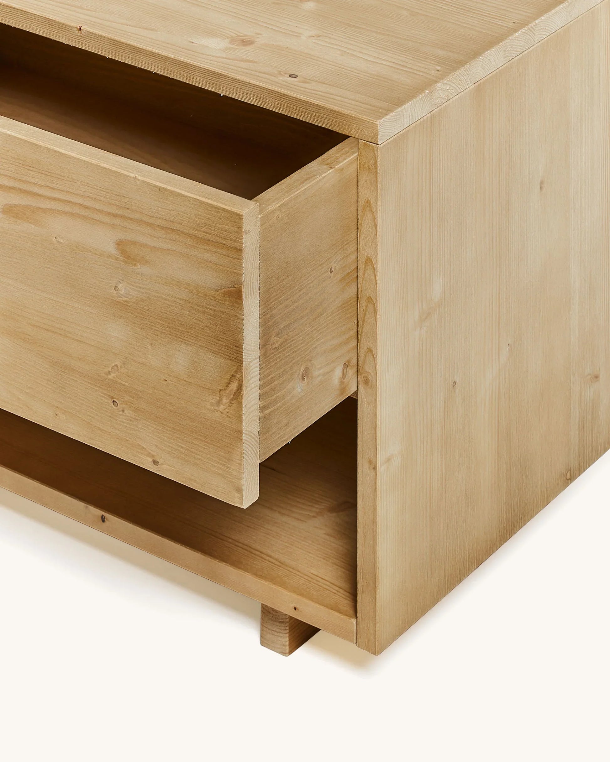 A quiet blend of purity and purpose. The Renna Nightstand is crafted from natural solid wood with clean, minimalist lines that highlight the beauty of raw materials. Its open-shelf design and seamless drawer provide functional elegance, perfect for grounding your bedside with warmth, clarity, and intention. Each piece is handcrafted, making every Renna uniquely yours.