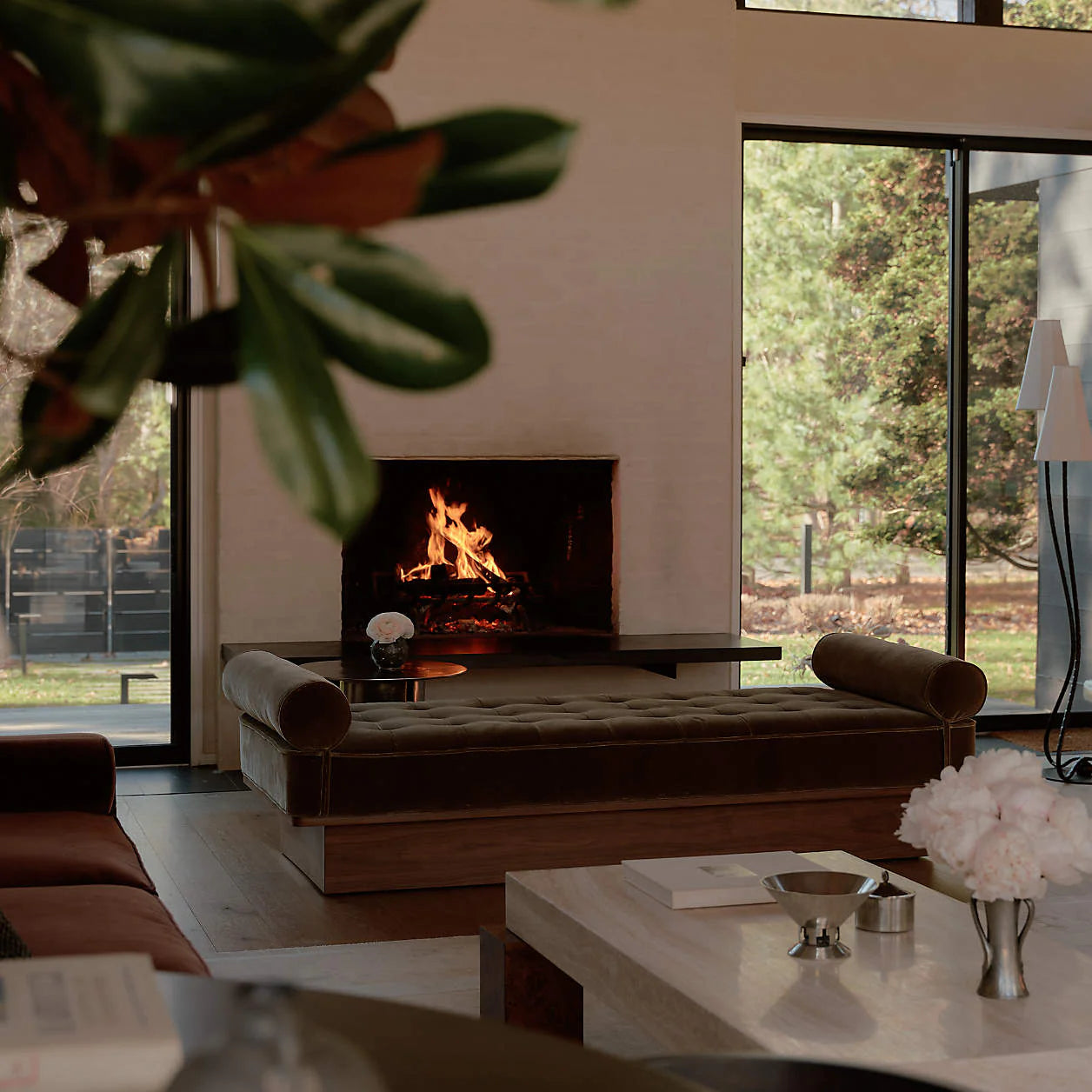 Timeless elegance meets modern minimalism in the Reposer Daybed, designed by Athena Calderone. Wrapped in rich, velvet upholstery and anchored by a sculptural wood base, this piece is both a functional lounger and a striking statement. Its tufted cushion and cylindrical bolsters offer structured comfort, perfect for reading, relaxing, or simply elevating your living space.